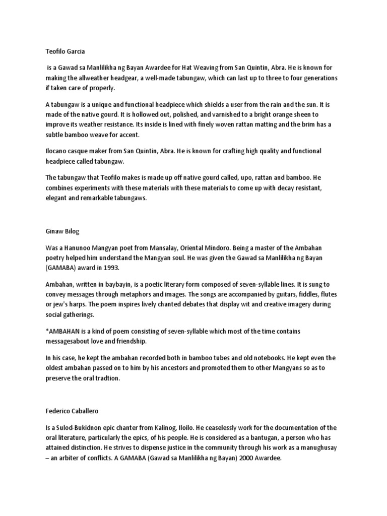 Teofilo garcia (2012) is an awardee from san quintin, abra renowned for his tabungaw (upo in tagalog, bottle gourd or white pumpkin in english) hats, as well as one of the last practitioners of the art teofilo. Gayunman, kapag nakatapos sa mga gawain sa bukid, inaasikaso niya ang pagtatanim ng…